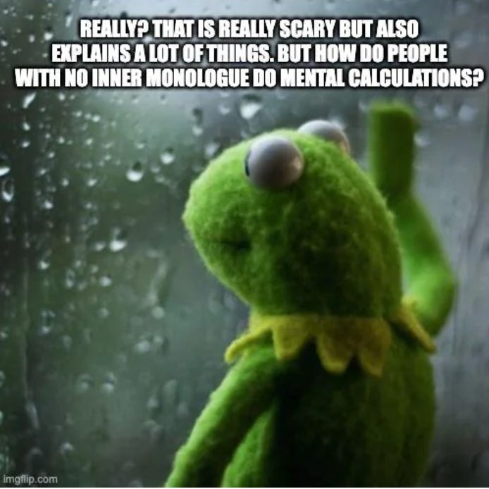They are all wrong, of course. First, let me address the claim that we who have no internal monologues are unthinking NPCs walking around without any discernible brain activity happening.