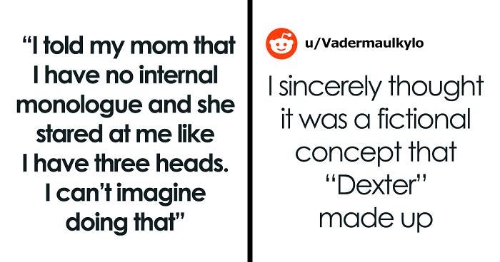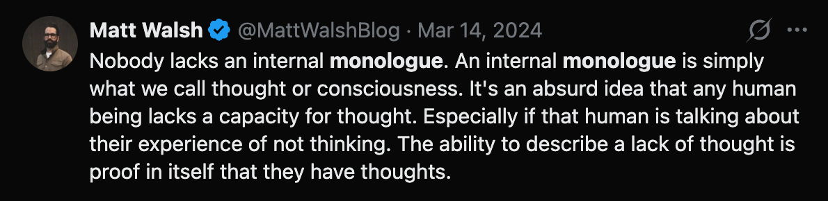 I lost it in the doomscroll but it essentially said ‘When you hear that there are people without Inner Monologues walking around, it explains a lot of the retarded, NPC behaviour we see in the world. People just walk about without a single thought in their head. LOL LOL LOL. I’m a fat 30 something loser who lives in my mother’s basement, plays Fortnite all day and masturbates into lukewarm Hot Pockets’.